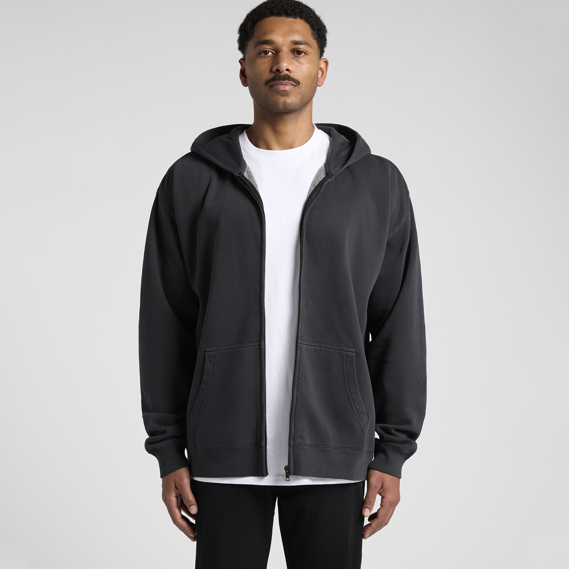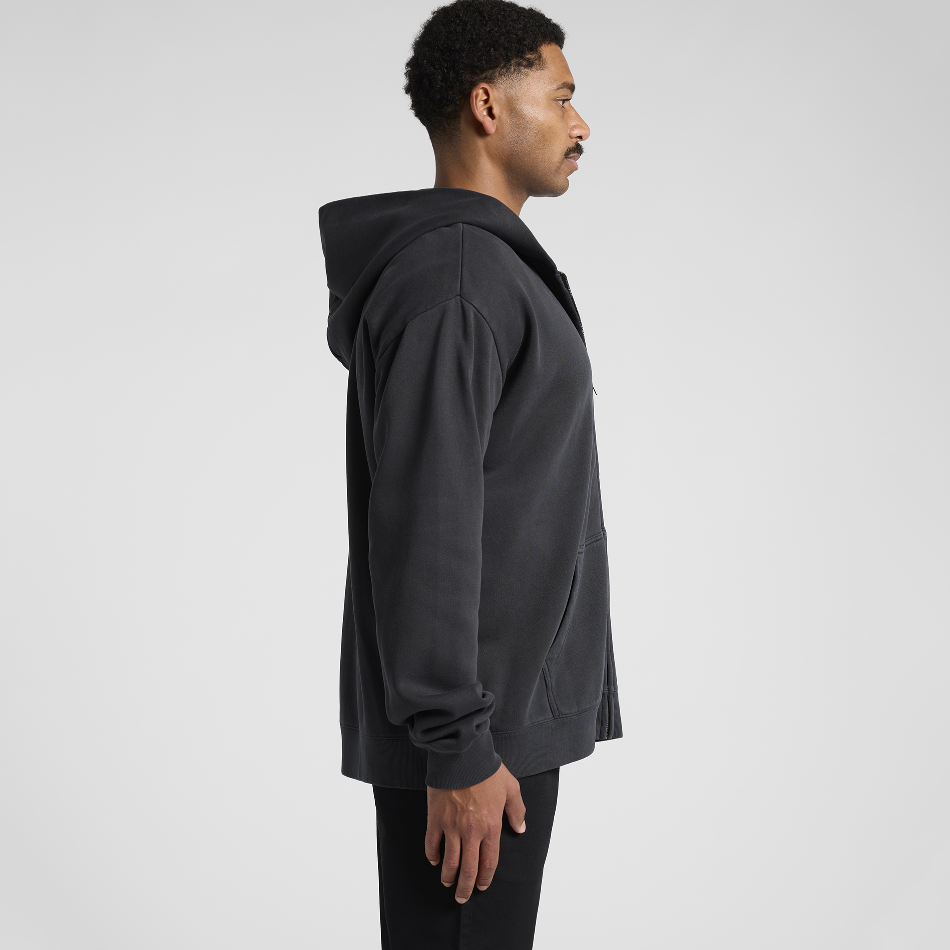 Garment dyed, zip hood, drop shoulder, kangaroo pocket, self-fabric lined hood, no drawcord, SBS two-way zip, sleeve cuff ribbing, CVC fleece, preshrunk to minimise shrinkage
