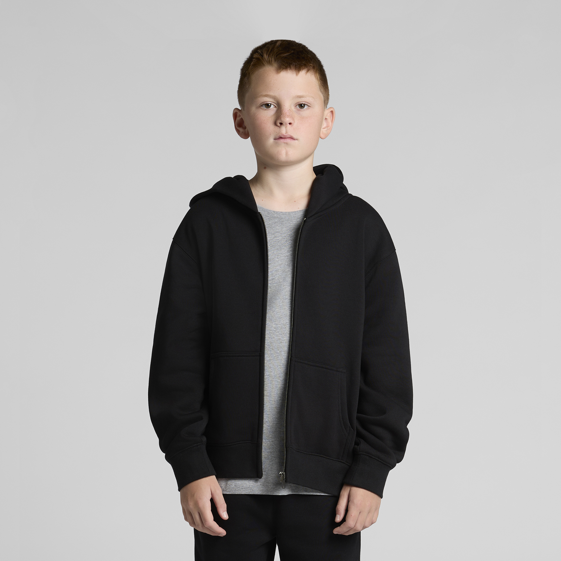 Construction: Zip hood, drop shoulder, kangaroo pocket, self-fabric lined hood, no drawcord, YKK zip, sleeve cuff ribbing